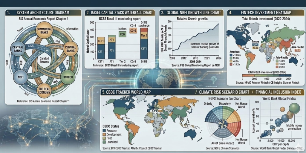 | System Architecture Diagram | Circular flow diagram showing funds, risk, and information flows between commercial banks, central banks, NBFI, fintech, and the real economy. Reference: BIS Annual Economic Report Chapter 1. |